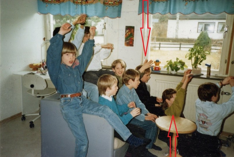 Födelsedagskalas framför NES:et i Sörskogen, ca. 1990.